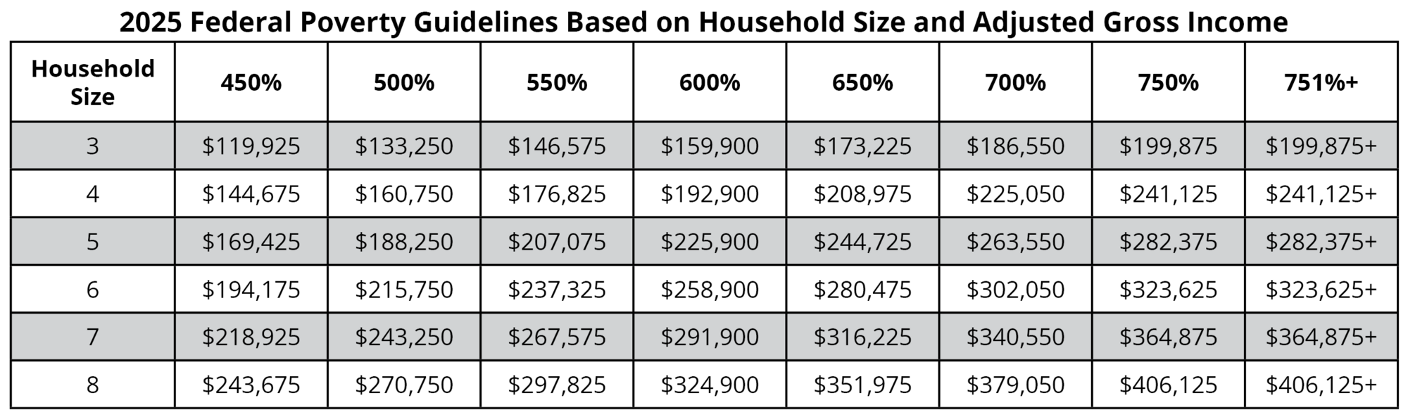 Click here for the full chart of of different multiples of poverty guidelines found on the United States Department of Health & Human Services web site. Click here for the FY2025 scholarship award amounts.